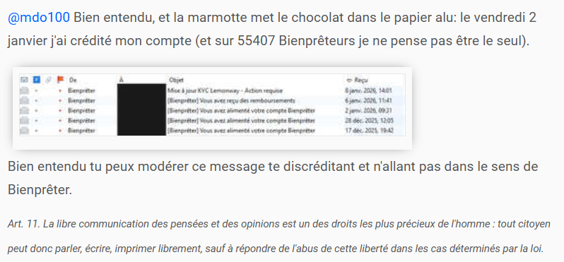 @mdo100 Bien entendu, et la marmotte met le chocolat dans le papier alu: le vendredi 2 janvier j'ai crédité mon compte (et sur 55407 Bienprêteurs je ne pense pas être le seul).