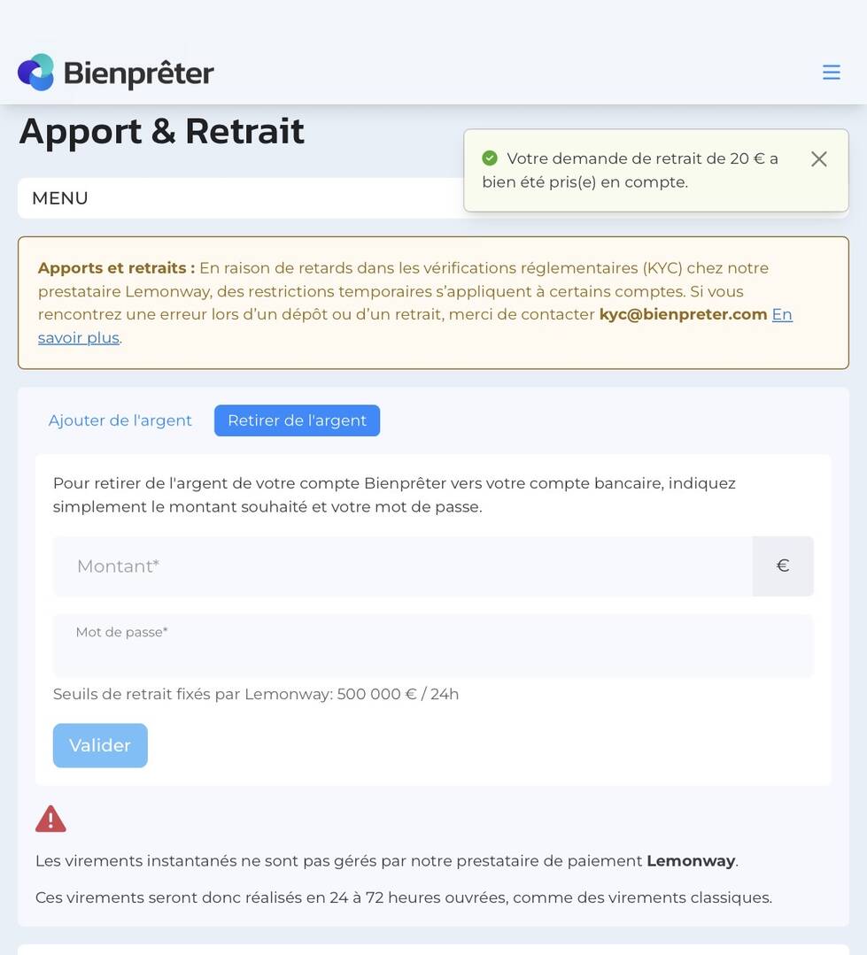 Bonjour ; juste pour participer à la discussion, j’étais également bloqué mais depuis jeudi je ne le suis plus. La seule chose que j’a faite : envoyer mon mail à KYC @bienpreter.com , derrière j’ai reçu un nouveau KYC a remplir. Tout fonctionne. pour indication, Les Entrepreteurs sont également impactés. Aucun retrait possible, le support est dessus