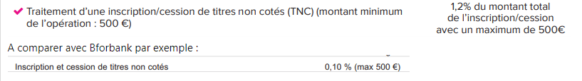 C’est indiqué dans leur brochure tarifaire : 1,2% du montant total avec un maximum de 500 € (qui ne concerne guère le financement participatif pusqu’il faudrait dépasser 41 K€ sur une seule opération pour atteindre ce maximum). À noter que le débouclage de l’opération, quand le titre non coté est liquidé par l’opérateur, n’est pas une cession, donc on ne paie que lors de l’inscription du titre.